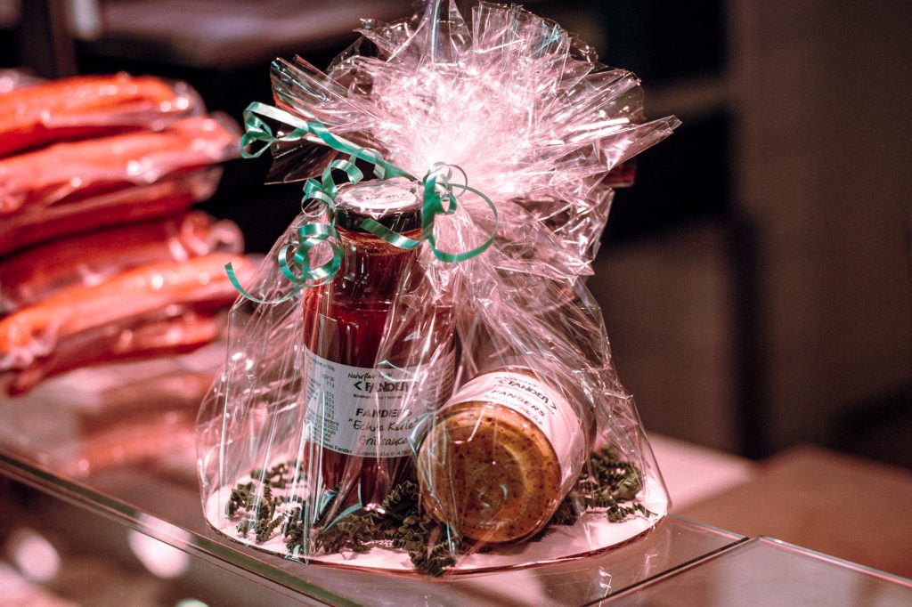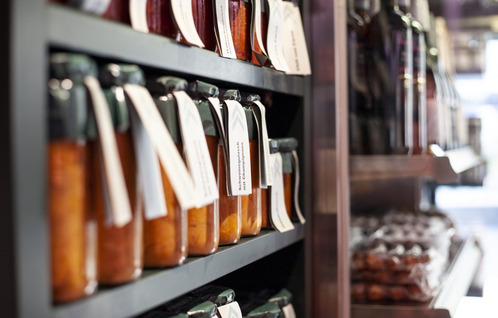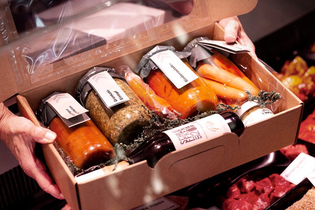 Unsere Hausmannskost in Gläsern nach Rezepten von Großmutter Gerta Fander: Niederrheinischer Sauerbraten, Rindergulasch, Grünkohleintopf, Wiener Würstchen, 2 Fanders Mettwürstchen, Fanders hausgemachter Senf – Männersache, 0,5l regionales Bier.